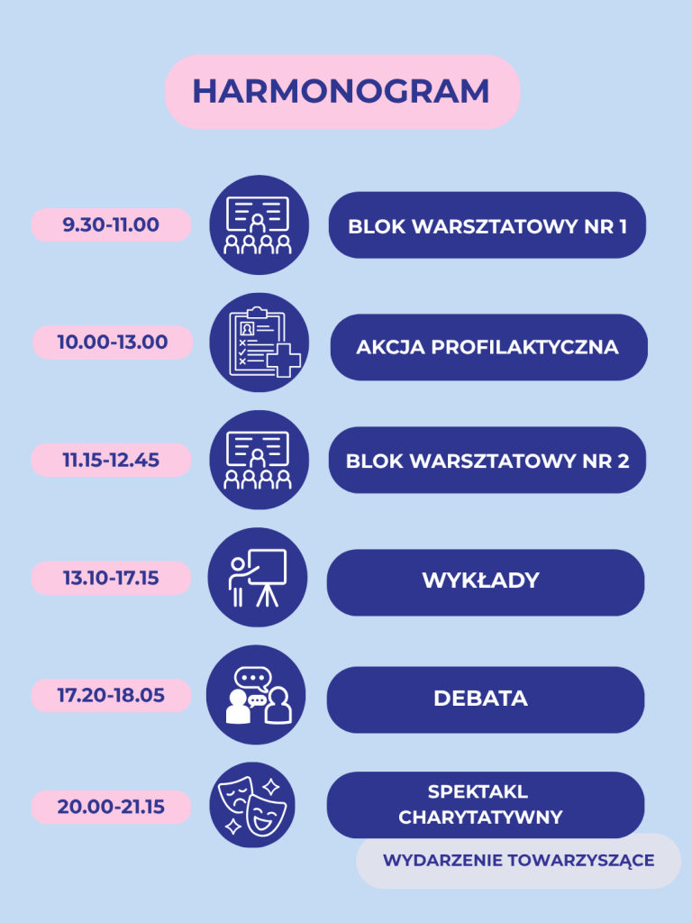 W programie przewidziano m.in. wykłady ekspertów, warsztaty tematyczne, debatę o dobrych praktykach wspierających pacjentów onkologicznych, spotkania ze specjalistami, akcję profilaktyczną koordynowaną przez prof. Antoniego Szczepanika – specjalistę chirurgii i diagnostyki ultrasonograficznej. Na scenie pojawią się m.in.: